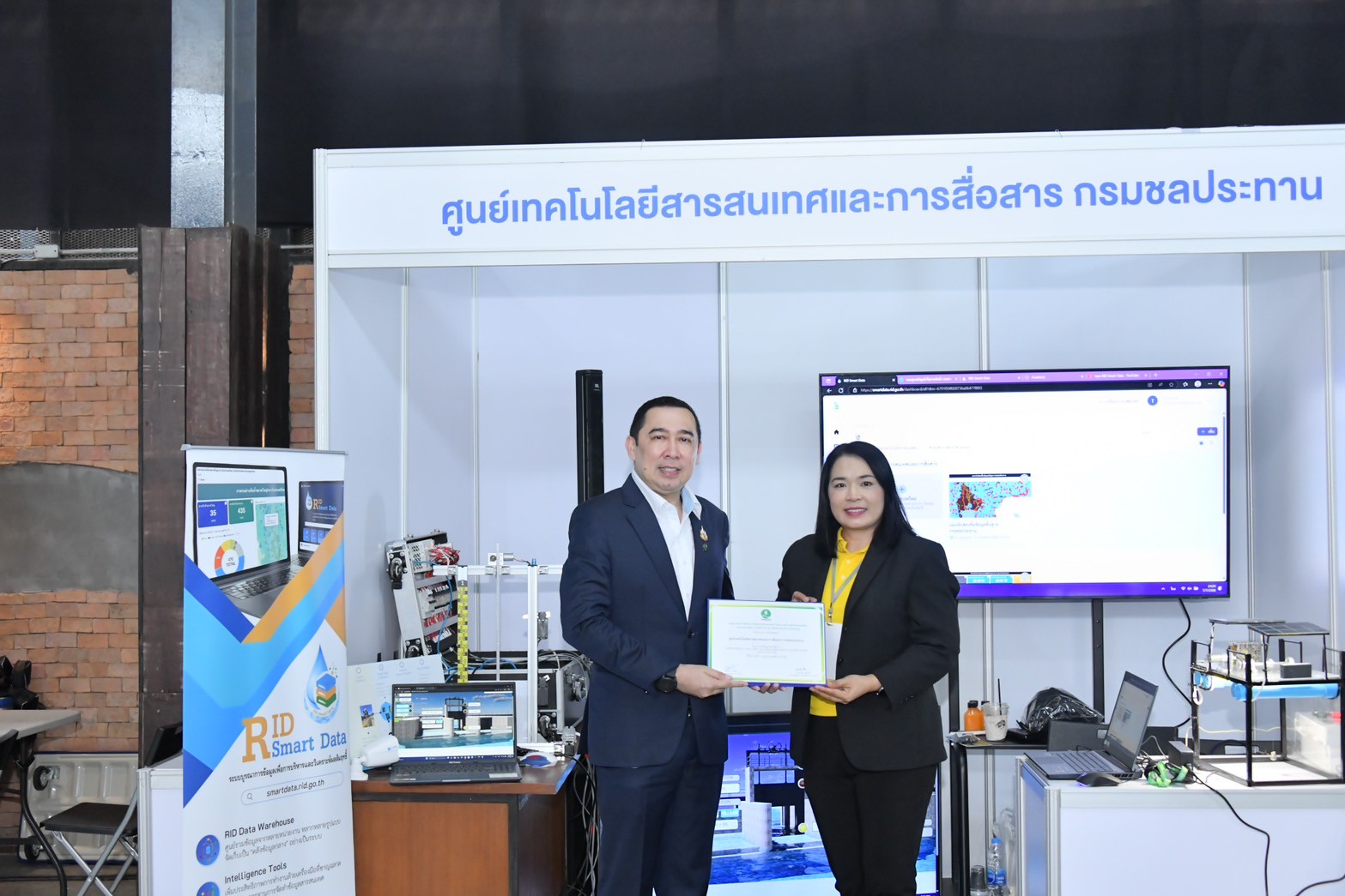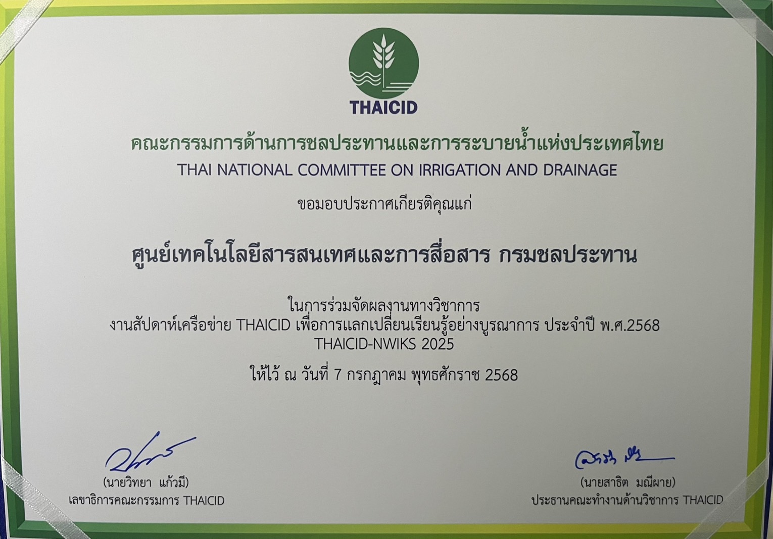นายธนพล สงวนตระกูล ผู้อำนวยการศูนย์เทคโนโลยีสารสนเทศและการสื่อสาร นายเกรียงไกร ภูมิสิงหราช ผู้เชี่ยวชาญด้านวิศวกรรมไฟฟ้าสื่อสาร (ด้านวางแผนและโครงการ) พร้อมด้วยผู้อำนวยการส่วน หัวหน้าฝ่าย และเจ้าหน้าที่ศูนย์เทคโนโลยีสารสนเทศและการสื่อสาร เข้าร่วมงาน และร่วมจัดแสดงผลงานวิชาการ ในสัปดาห์เครือข่าย THAICID เพื่อการแลกเปลี่ยนเรียนรู้อย่างบูรณาการ ประจำปี 2568 (The THAICID Network Week for Integrated Knowledge Sharing 2025 : THAICID-NWIKS 2025) จัดขึ้นระหว่างวันที่ 7-9 กรกฎาคม 2568 ณ สถาบันพัฒนาการชลประทาน อ.ปากเกร็ด จ.นนทบุรี