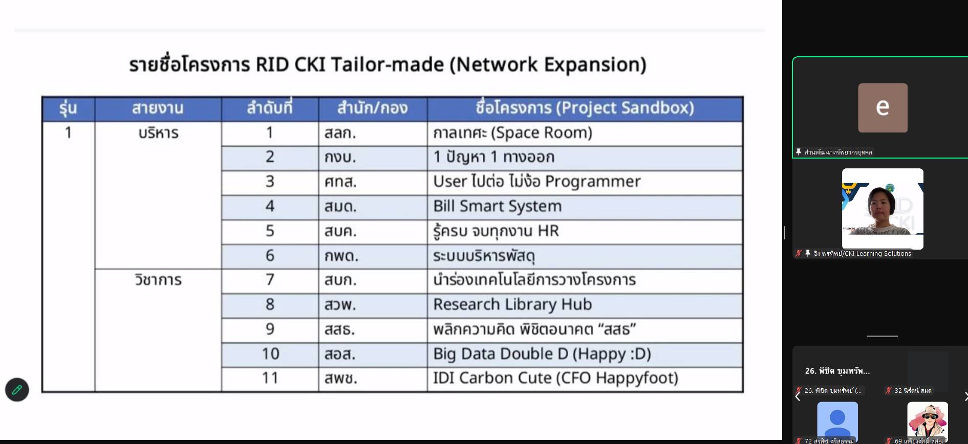 วันที่ 8 เมษายน 2569 นายเกรียงไกร ภูมิสิงหราช ผู้เชี่ยวชาญด้านวิศวกรรมไฟฟ้าสื่อสาร (ด้านวางแผนและโครงการ) นายราชพล หิรัญรักษ์ ผู้เชี่ยวชาญด้านเทคโนโลยีและระบบสารสนเทศ และ นายพิชิต ขุมทรัพย์ หัวหน้าฝ่ายมาตรฐานเทคโนโลยี ร่วมโครงการสัมมนาเชิงปฏิบัติการ CKI Level Up ครั้งที่ 1 ผ่านระบบออนไลน์ จัดโดยส่วนพัฒนาทรัพยาบุคคล สำนักบริหารทรัพยากรบุคคล โดยได้รับเกียรติจาก อาจารย์พรวิไล ธรรมพานิชวงศ์ และอาจารย์ศิลป์ชัย จุลสุคนธ์ จาก CKI LEARNING SOLUTIONS CO.,LTD และคณะเป็นวิทยากร เพื่อติดตามผลความคืบหน้าการดำเนินโครงการ RID CKI Tailor-made ในกิจกรรม Team Project Sharing ในการเสริมสร้างแนวทางปฏิบัติตามค่านิยมและวัฒนธรรมของกรมชลประทาน และเสริมสร้างการจัดการความรู้ที่เชื่อมโยงกับการสร้างนวัตกรรมในการทำงาน